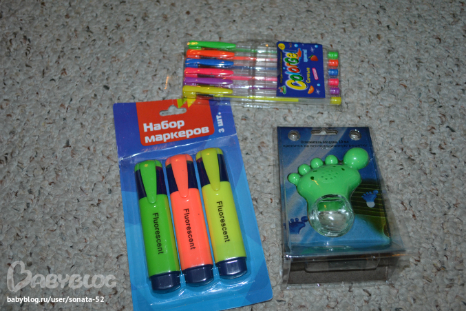 Еще дочке фломастеры с ручками и освежитель воздуха....я его в машину положу....такой прикольный, как Мишина ножка прям....