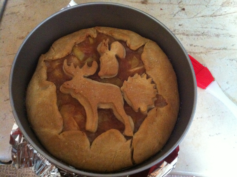 Оставалось полторы банки яблочных заготовок от родителей, решили, что как варенье уже не влезет, испечем-ка мы пирог, но не шарлотку, а открытый. Плюс нам с Даней надо развивать моторику, учиться давить пальцами и руками, так что фигурки делали вместе. Основной был лось, потом белка и еж.. края неровные у пирога, но мы пытались изобразить елины ветви, будто раздвигаем их в лесу и видим на поляне животных;