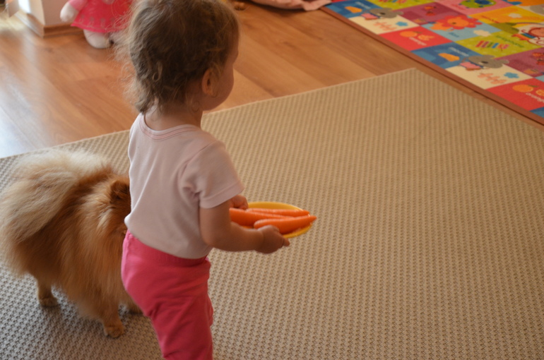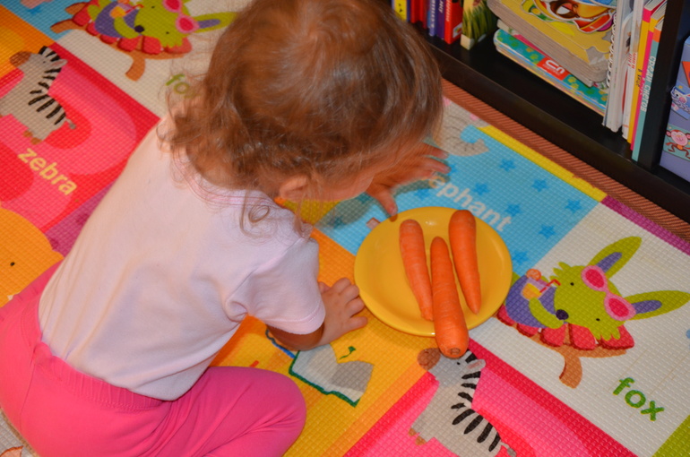 Для игры использовали две тарелочки (пустую и наполненную морковкой), расставленные в разных местах комнаты. Нужно было брать по одной и нести в пустую.