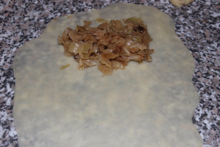 Тесто: - 2-2,5 ст муки - 0,5 ст масло растительное - 0,5 ст воды - соль около чайной ложки Начинка может быть любой, если добавить корицу-сахар-яблоки, получатся мини штрудели, у меня в этот раз тушёная капуста. Смешиваем воду, масло, соль, муку, как только тесто перестаёт липнуть- тесто готово, месить его очень легко, так же как и раскатывать.