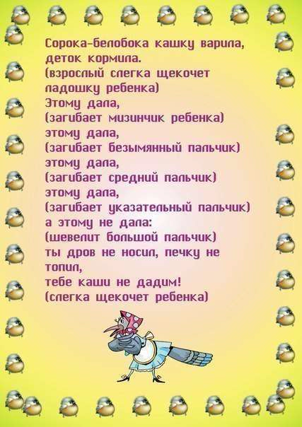 Насколько ребёнку понравится игра зависит во многом от исполнения взрослого. Для самых маленьких важно спокойно-ласковое настроение и осторожное, бережное прикосновение. Для детей трех-пяти лет имеет большое значение выразительная мимика и речь взрослого. Конечно, для выразительного исполнения взрослому следует выучить стихи наизусть.