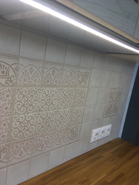 В рабочей зоне дополнительно сделала подсветку, очень недорого и очень удобно. Включается и выключается без прикосновения рук. просто провести рукой под датчиком.