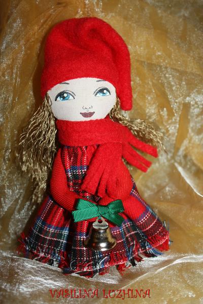 Вот и третья девочка...Фотки, надо сказать, отвратительные. Операционку поменяли, а вместе с ней ушла моя программа по обработке снимков. К новой не могу подойти, ерунда какая-то, всплакнула даже...Ну, так вот, девочка из бязи. Тонировка - акрил с напылением снега. Костюм - амер. хлопок, шерсть, метанит. В руках - елочное украшение. Высота 55 см.
