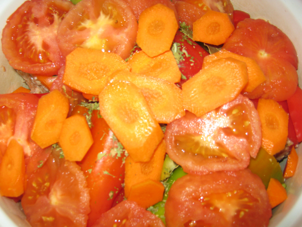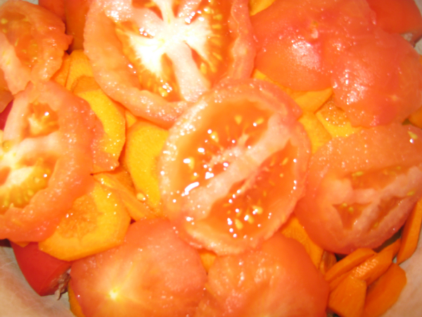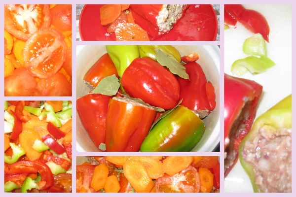 2. Заварить в кипятке 5 средних помидоринок (чтоб снять кожуру), затем сливаем воду и чистим, режем морковь, можно и нашинковать и вместе с помидорами выкладываем на перец