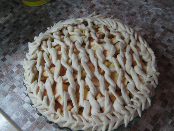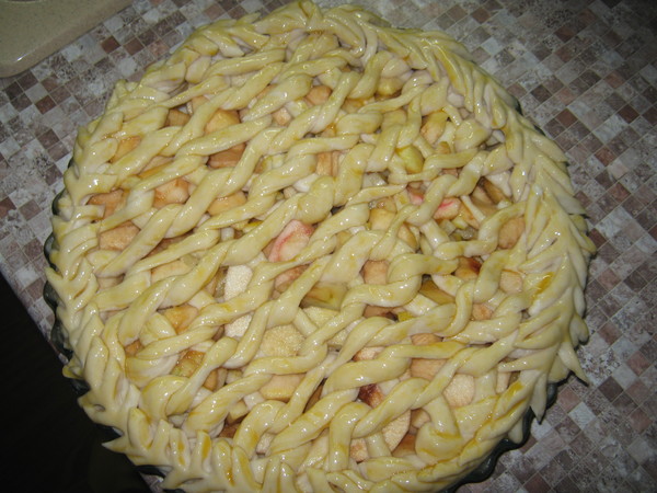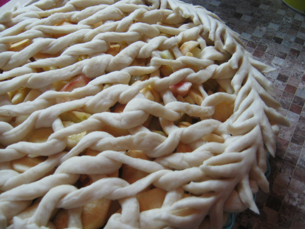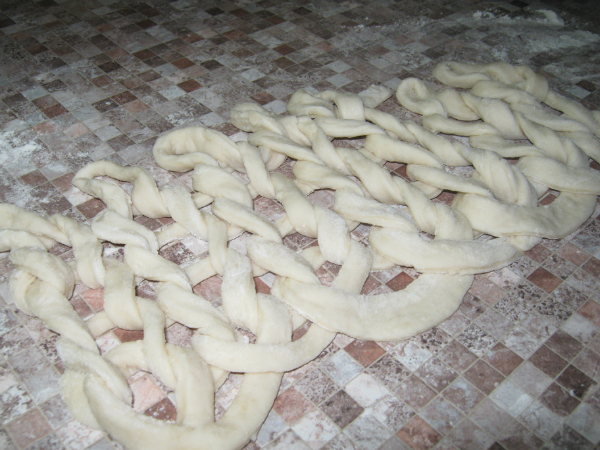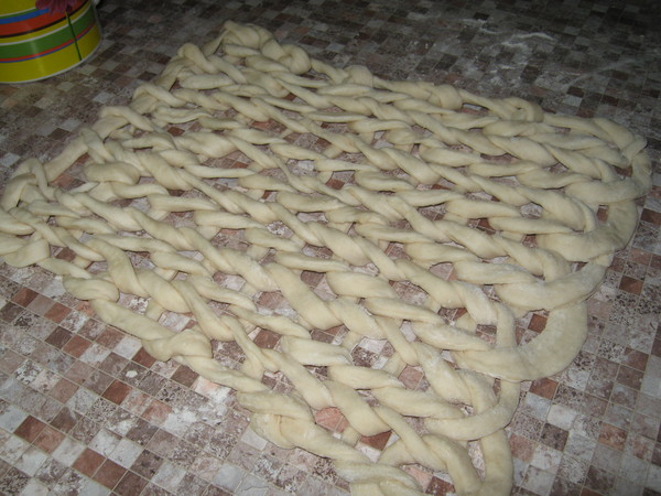 Берем 2 часть теста, раскатываем, нарезаем полоски и начинаем плести