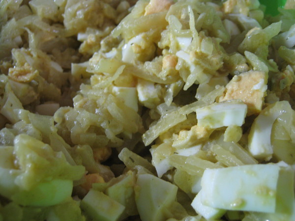Яйца чистим, режим крупно, даем капусте остыть, затем соединяем