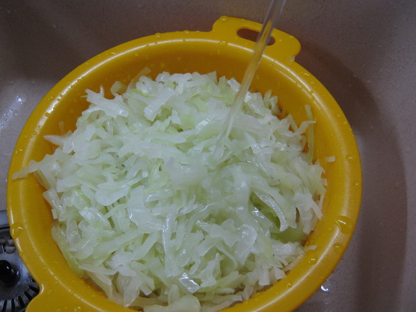 Складываем в кастрюл, солим. Ставим чайник, заливаем капусту крутым кипятком и на плиту прокипеть 5 минут. Затем откидываем на дуршлаг и промываем проточной водой