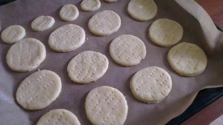 4. Тесто раскатать толщиной в 3 мм, нарезать печенье и выложить на застеленный пекарской бумагой противень.