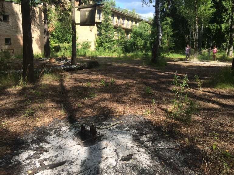 Пока друзья собирали ее, я решила немного углубиться за корпус... И нашла большое костровое место...Когда подошла ближе... ооооуууу... а костер то совсем недавно потухший.. еще даже пепел не разлетелся... а если учесть, что ночью был дождь.....