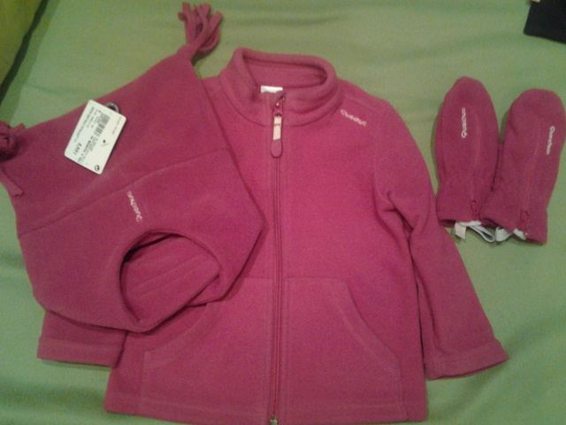 Флисовый комплект на 2 года (шапка новая,варежки 1 раз,кофту носили,очень удобно и тепло),фирма Quechua,размер 2-3 года 500 руб(или по отдельности)