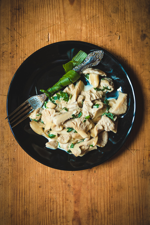 Белые грузди, сливки, белый перец, соль, сливочное масло, зелёный лук
