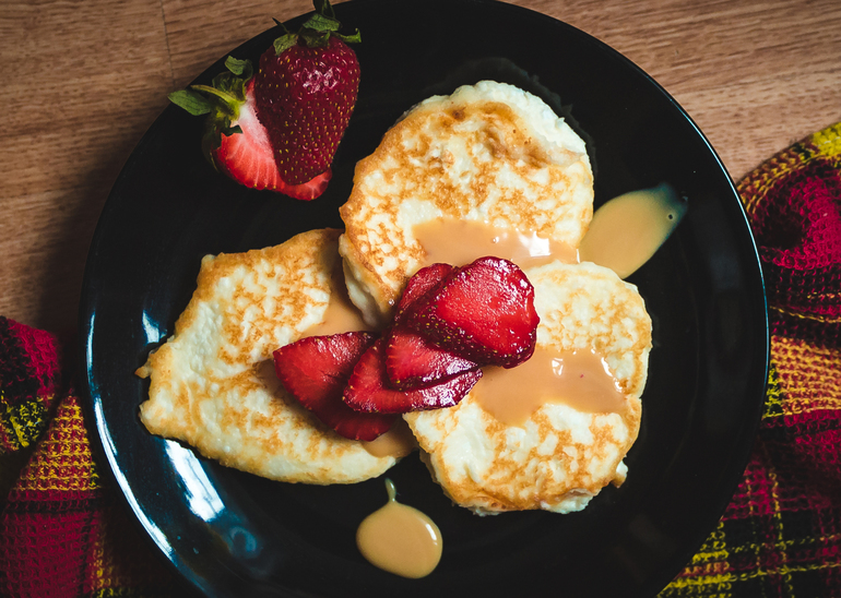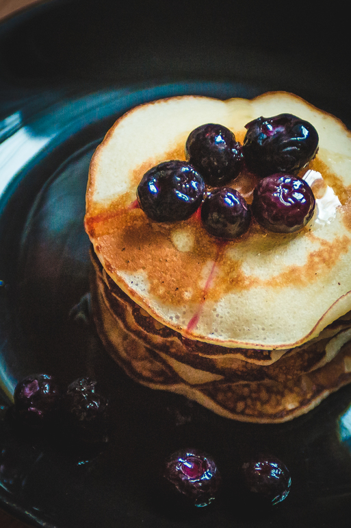 Мелким персиковые оладья с персиком, а тем кто побольше оладья с мёдом и черникой
