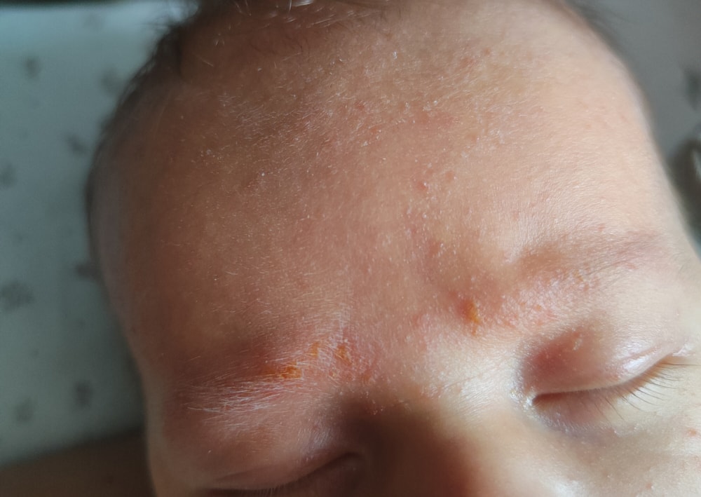 Фото прилагаю. Неделю назад акне почти прошло и вот опять обсыпало, ещё сильнее ( и корочки появились за ушами и на бровях. В педиатру только на следующей неделе. Понимаю что скорее всего это норма, но все равно тревожно