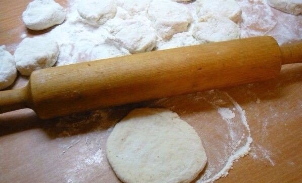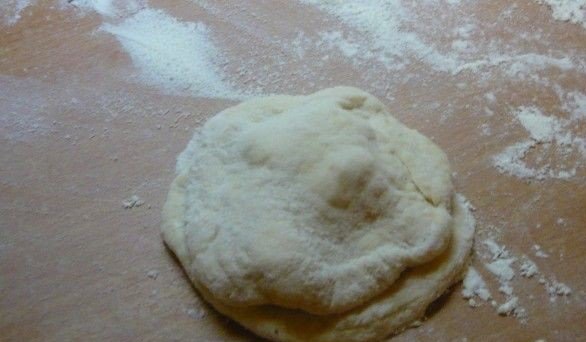 3. Обминаем их в муке и слегка раскатываем скалкой. Кусочков должно быть четное колличество.