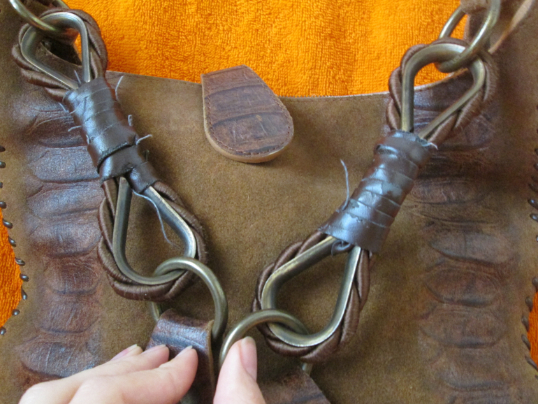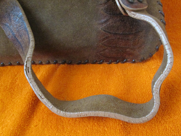 б.у. никаких повреждений на сумке нет, она идеальна, внутри тоже все как новое. из недостатков - отсутствует бегунок на змейке, потрепалась кожа на ручке и немного на углах сумки, расклеялась местами ( видно на фото)