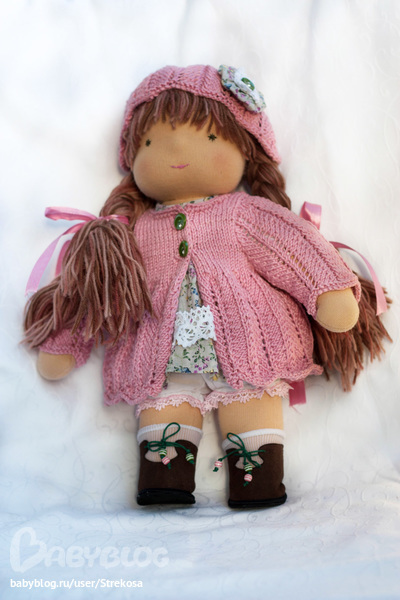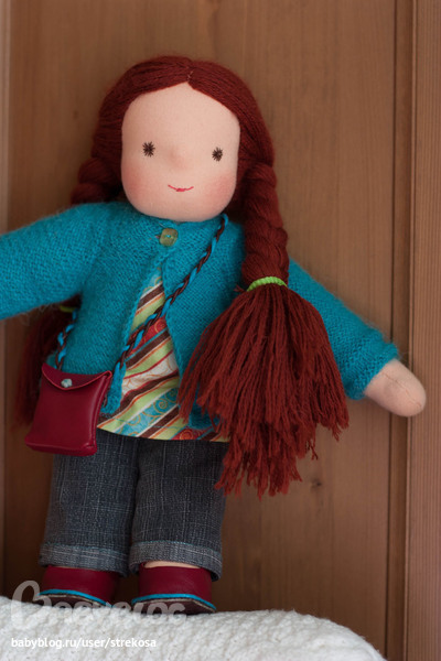 Выполнена только из натуральных материалов, по традиционной вальдорфской методике. Сшита из специального кукольного трикотажа, набивка - 100% биосливер(непряденая овечья шерсть). Для изготовления кукольного гардероба использовала американский хлопок, хлопковую джинсовую ткань, мягкую кашемировую пряжу, ботиночки и сумочка - кожа.