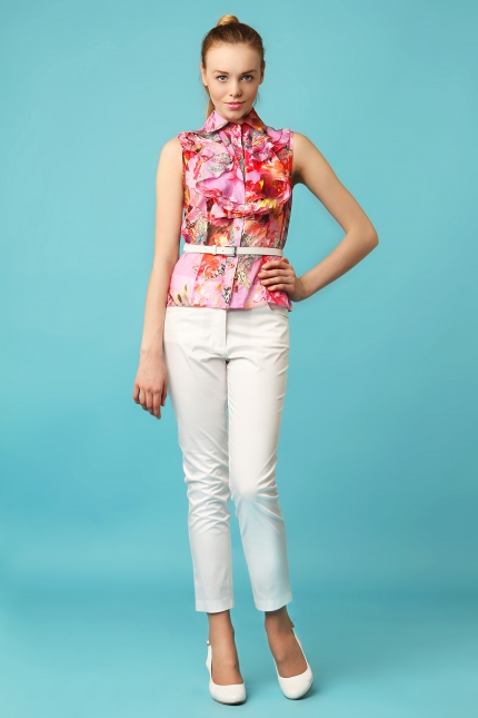 Легкая романтическая блуза выполнена из тонкого хлопкового полотна. Блуза прилегающего силуэта с отложным воротником со стойкой. Прилегание достигнуто за счет талиевых вытачек на полочке и спинки. В плечевые срезы и срез горловины вставлен двухслойный волан.