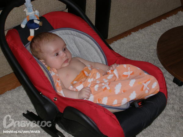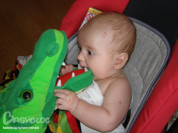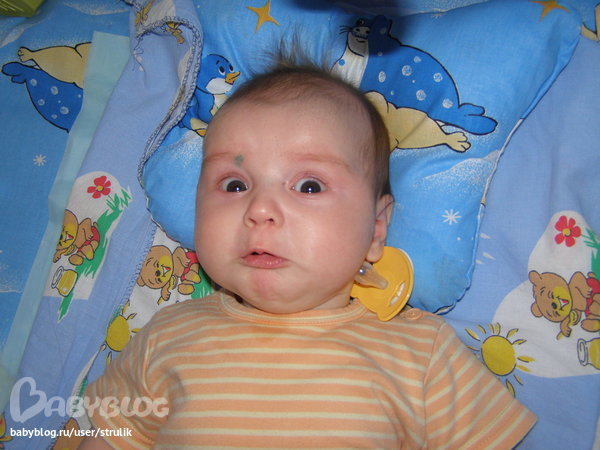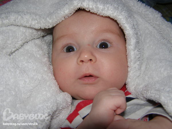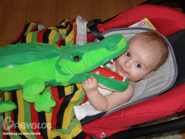 Что же мы наели за последний месяц: вес 6900, рост 62 см. Поставили прививки, решили ставить инфанрикс, реакции не было никакой, надеюсь, что и следующие переживет так же. Начали все хватать и тащить в рот, любит разглядывать свои ручки и игрухи (теперь игрухи висят на всех колясках). Может лежать один и разговаривать (громко и с выражением). Улыбаемся все время, особенно, когда в поле зрения попадают любимые. Слюни... если соса не во рту, то слюни повсюду. Научился радостно визжать, а вот смеха откровенного мы еще не слышали. Переворачиваться пока не хотим и даже не пытаемся.