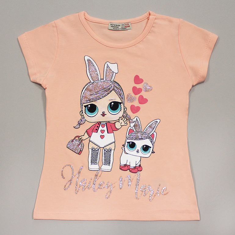 - на груди украшена принтом с популярными куколками (принт дополнен блестками)