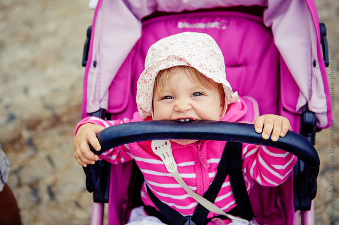 У Сони лезут очередные зубы, беспокоить они стали еще на Кипре и вот до сих пор=( Соня сходит с ума порой, грызет всё с особым остервенением и это реально так. К сожалению она так глупоко засовывает ручки в рот, что ее периодически тошнит=( А еще жара и ребенок очень плохо ест, поэтому я расстраиваюсь всё больше=( Вот сегодня вроде ей получше, и ела немного лучше, и всё съеденное осталось в ней=) А вот парочка фото, как Соня пытается выместить на коляске все отчаяние от постоянного зуда=)