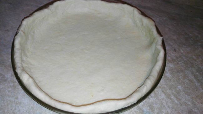 Через 30 минут вынуть тесто из холодильника. Раскатать по форме для пирога с запасом.
