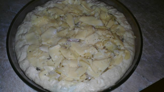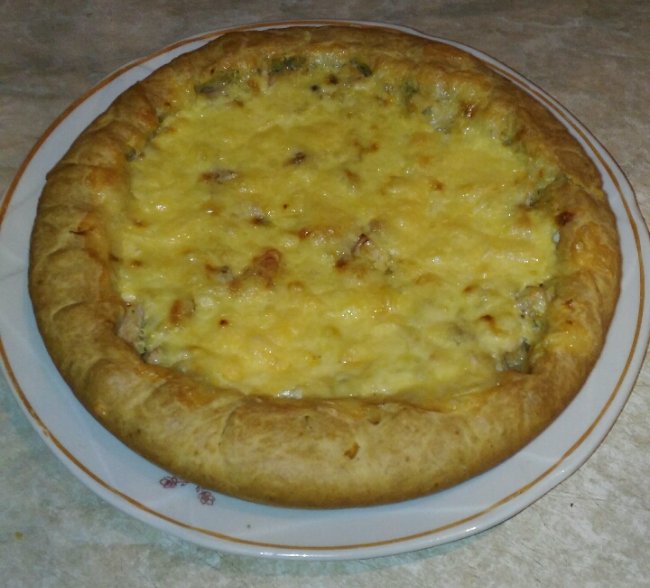 Выложить сверху курицу и жареный лук. Натереть сыр на крупной терке и равномерно посыпать им пирог сверху. Придать форму пирогу, фигурно защипав края.