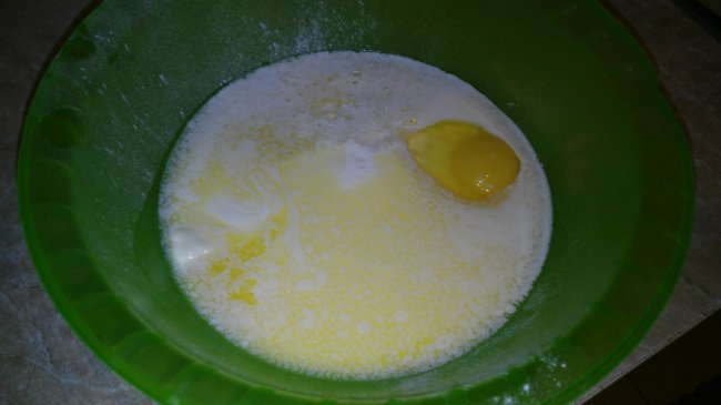 Приготовим сначала тесто. Просеять муку, добавить соль, разрыхлитель, яйцо, перемешать. Влить размягченное сливочное масло и сметану.