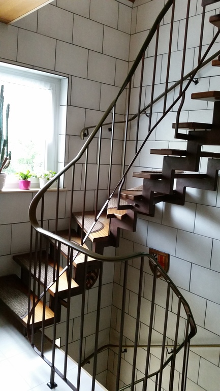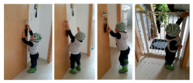 Научился открывать входную вдверь (мы ее не закрываем на ключ). Марк становится на носочки, цепляется за ручку пальчиками и тянет вниз. Все просто! Открывает и выбегает на лестничную клетку, начинает подниматься по лестнице на верх, или спускается вниз. У меня от этого зрелища сжималось сердце, так как живем на втором этаже, и лестница у нас небезопасная. После пары раз таких открываний, поставили защиту на дверь. Теперь я спокойна))