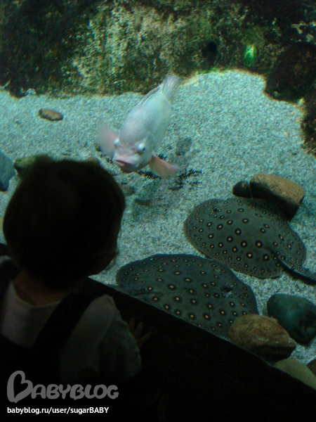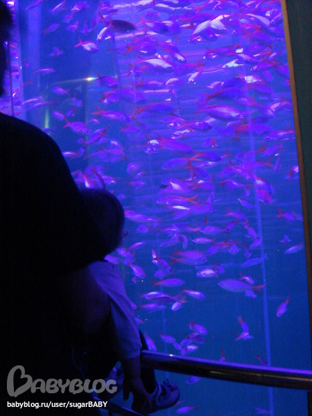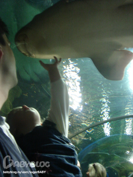 Когда мы ехали на движущейся дорожке по стеклянному тоннелю над нами улеглась огромная рыбина - то ли сом, то ли акула. Ксюшка якобы почесала ей брюхо: