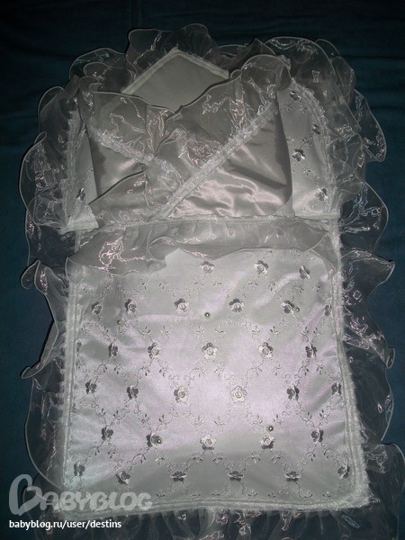 В общем, выглядит, как прямоугольный конвертик (сбоку молния). Уголок на кнопочках, можно сделать капюшончиком, а можно расстегнуть. Если перевернуть конвертик, там есть прорези для ремней в коляске. Буду использовать этот конверт для переноса малыша на руках, в коляску класть, да и как спальник запросто! Очень удабная вещь. Фирму не помню (какая-то французская), под рукой комплекта нет, к сожалению.