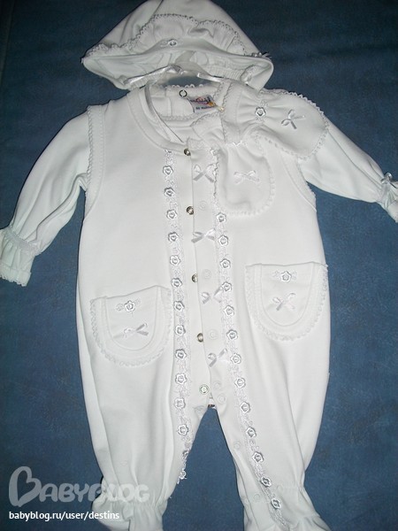 У нас на выписку приготовлен слипик х/б , шапулька х/б и комбинезон с капюшоном потеплее и тоже х/б - все размера 56. Еще есть одеялко в тон на случай прохладной погоды, укроем в люльке.