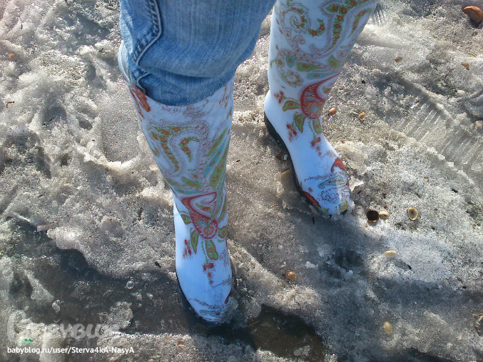 Это конечно жуть, никогда ни думала что буду разгуливать в резиновых сапогах, но сегодня теплынь 3 день, на улице жуть как мокро и еще хуже везде- везде грязь, говно и мусор((( В срочном порядке на второй прогулке вызванила нашу бабушку(мою маму) и упросила довезти до магазина за галошами)))
