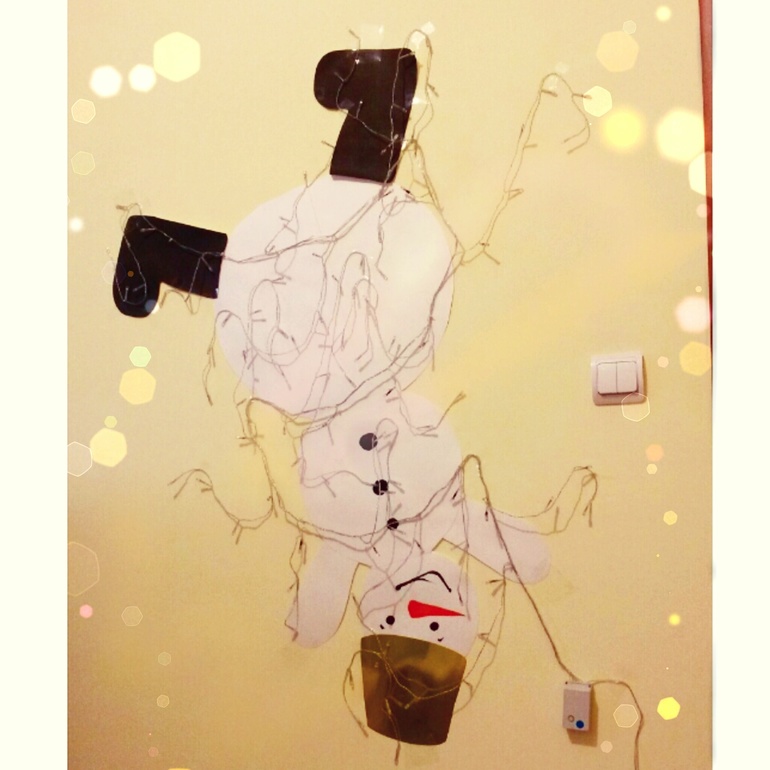 Хотелось мне уже гирлянду повешать, в инете видела оленя запутавшегося, вот решили запутать снеговика))))