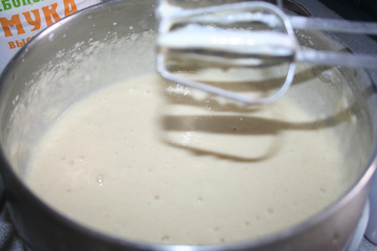 Тесто готовится элементарно: миксером взбиваем яйца с сахаром, добавляем к ним манку, кефир, соду и снова взбиваем. Последней добавляем муку и еще раз очень хорошо взбиваем. Тесто получается достаточно жидкое.