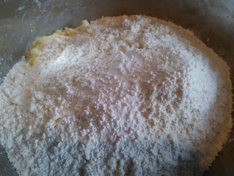 Тщательно перемешать, всыпать примерно 3 стакана муки (не переборщите!) и 1 ст.л. разрыхлителя: