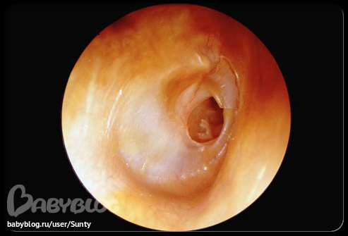 Если количество жидкости в среденем ухе слишком большое, давление на барабанную перепонку растет и может привести к ее разрыву (как на картинке). Признаком этого будут желтые, коричневые или белые выделения из уха. Возможно также мгновенное исчезновение болевых симптомов, ведь ухо освободилось от беспокоившего его отека. Как бы мрачно не звучал диагноз («разрыв барабанной перепонки»), не стоит отчаиваться – она срастаеться, как правило, в течение нескольких недель.