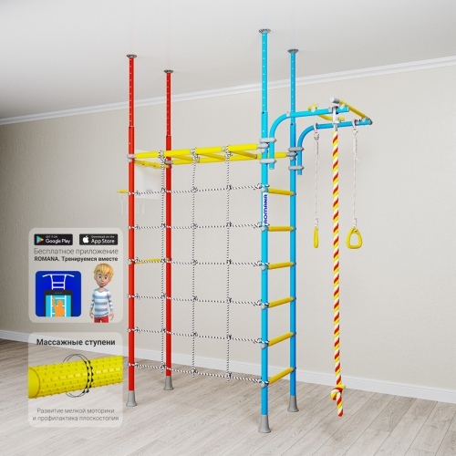 КОМПЛЕКТАЦИЯ: лестница гимнастическая, турник подвижный, рукоход, щит баскетбольный, канат, кольца гимн., сетка.
