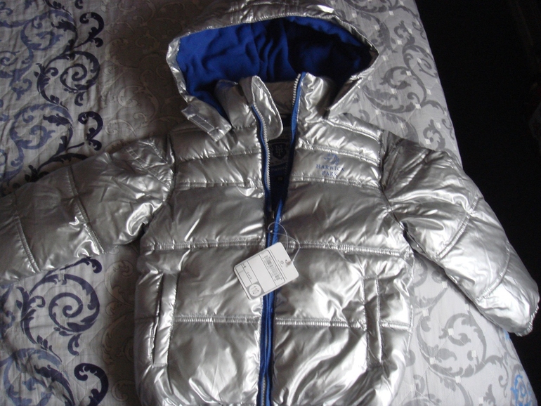 2. Куртка серебряного цвета, на рост 116 (маркировка 110), 1700 руб. Флис в капюшоне и на верхней части спины, остальное обычная подкладка. Утеплена на позднюю/холодную осень. Новая с бирками естественно, фирма C&A.