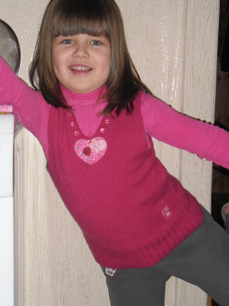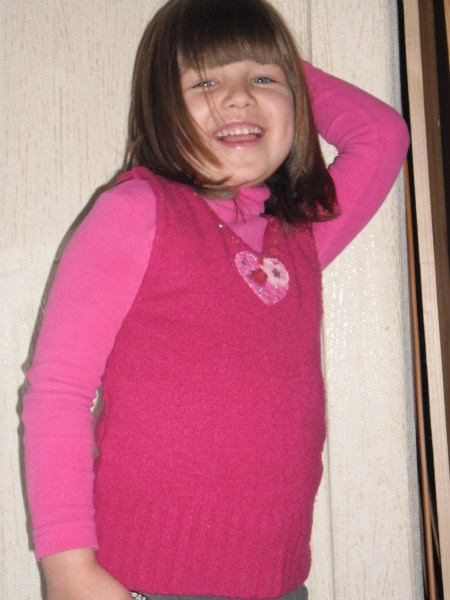 В воскресение сшила доче жилетку из своего старого свитера)))