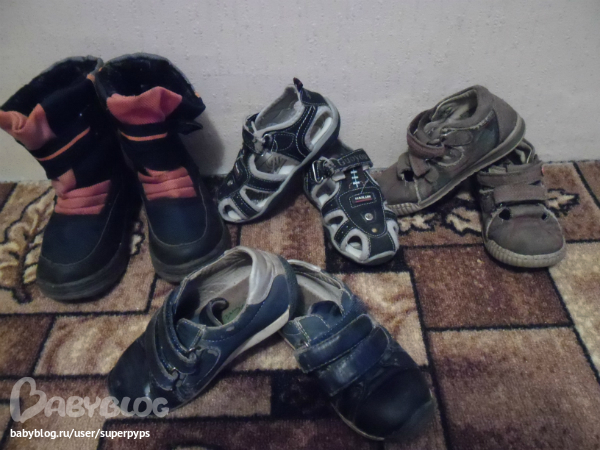 ботинки разошлись по шву, после двоих детей, сандали в нормальном состоянии, кросовки сильно б/у, но крепкие еще.