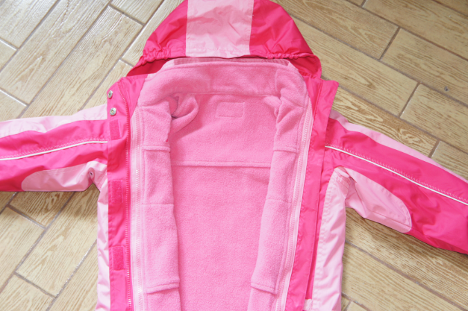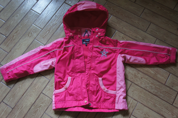 Куртка 2-в-1, может быть ветровкой, а если пристегнуть идущую в комплекте флисовую кофту, становится более теплым вариантом. Ветро-водонепроницаемая, яркая, сочная. Удобная, манжеты на липучках, сама куртка на молнии, кнопках, липучках. Размер 5 (110-116см).