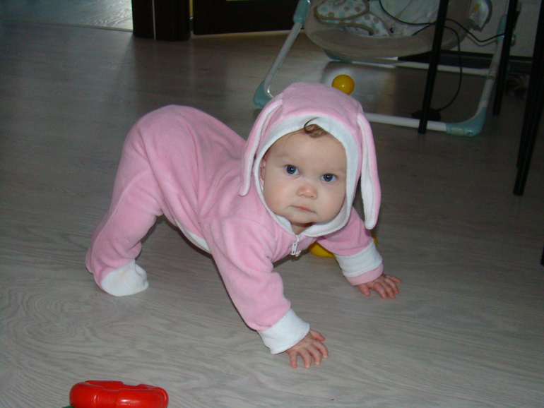 Ползать отказалась напрочь(( Встает вот в такую позу и пытается идти... Бьется, ревет и снова куда-нибудь ковыляет(((