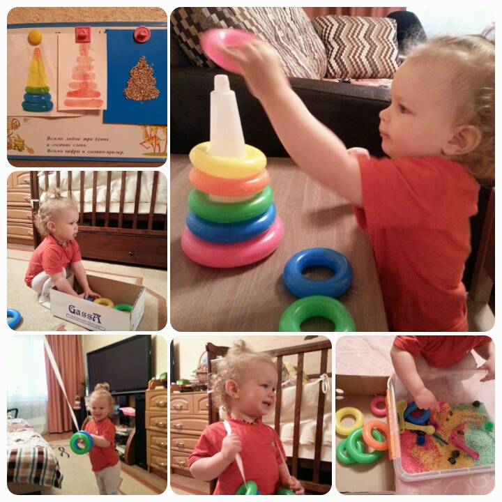 Наши развивашкиМы с дочкой Варечкой участвуем в ТН Игрушки,день первый посвящен Пирамидки.В пирамидку мы давно не играли и как оказалось, потеряли пару диталей, не хватает одного колечка и верхушки.На кануне вечером я собрала пирамидку,распечатала картинку,как назло,закончились краски в принтери,пирамидка получилась желто-голубого цвета.Картинку повесила на магнитную доску,которая будет для нас тематической стеной на протяжение всей недельки.Проснувшись утром дочка сражу побежала к игрушки, тут же разбросала все колечки, сорвала картинку и измяла ее.Я даже сфоткать не успела(Наши игры мы начали после завтрака.Разобрали пирамидку,посмотрели колечки,проговорили цвета,нашли самое большое и самое маленькое колечко.Собрали снова,построили башенку.Потом стали катать колечки по полу,собрали их в коробку.Надели колечки на ленту,покрутили ленточку,я держала один конец ленты,а Варя другой.Потом завязали конци ленты и Варя одела ленточку с колечками,как бусы)))С ленты колечки мы бросили в контейнер с крашеным рисом,стали закапывать колечки,но Варе это не понравилось,она выбросила все колечки из контейнера и стала пересыпать крупу.Сходили погулять,пообелали,по спали.После сна занялись творчеством, один шаблон мы раскрасили,а из второго сделала аппликацию из гречки.Это все задания,которые мы выполнили.