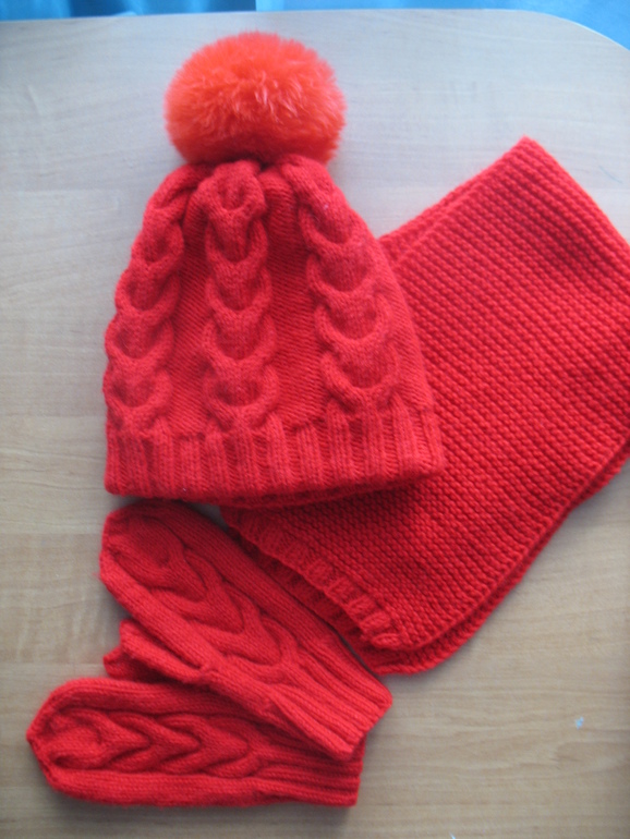 Довязала наконец шарф и варежки к Наташиной зимней шапке, и вовремя. У нас минус и идет снег.
