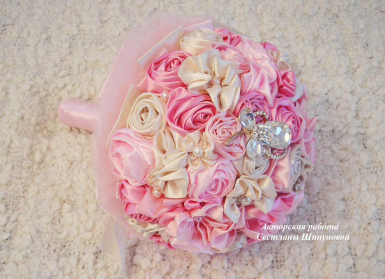 Невероятно нежный букет цветов из атласных лент, каждая розочка сплетена с любовью) Как я мечтала его сделать!)