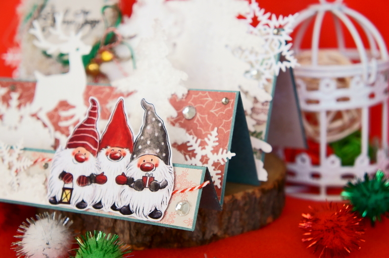 Всем добрый вечер. Пройдя во второй этап с открыткой с шейкером (конкурс ВК) получили новое задание - сделать открытку с гномиками.