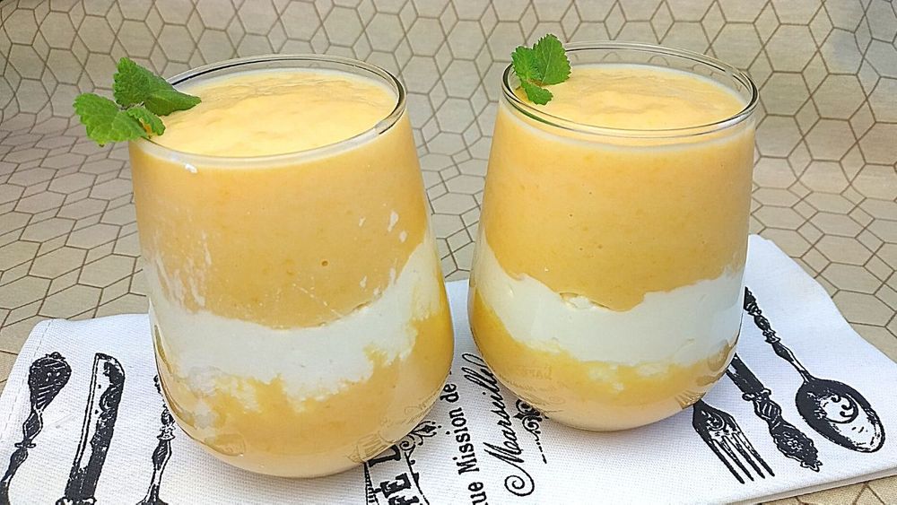 На дно высоких бокалов выложить слой персикового пюре, затем творожную смесь и сверху снова персиковое пюре.