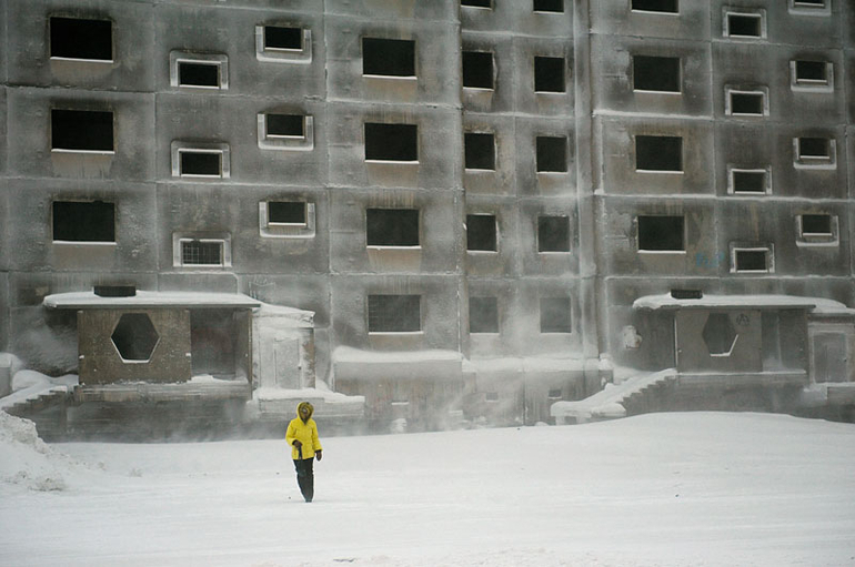 "Поездка на работу - самая настоящая экспедиция. Комбинат «Надежда» находится в 12 километрах от города. Дорога проходит через открытую тундру, где бушуют не знающие преград ветра. Во время пурги видимость нулевая, проезд закрывается для легкового транспорта, и передвигаться можно только со специальным разрешением штаба «Шторм». Тогда с автовокзала два-три раза в день отправляются колонны из 15−20 автобусов: если один из них сломается, пассажиров можно эвакуировать в соседний.