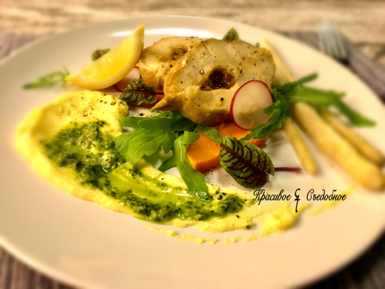 Заказала рыбку, как всегда с севера. Но поставщик накосячил, порезали мне на стейки мелкую треску (такую рыбку обычно не пилят, а продают целиком для запекания). Ни пожарить, ни на филе разобрать, пришлось запекать. Чтоб было не скучно, решено было сделать соусы. Зелёный-мой самый любимый-прелюбимый к рыбе и морепродуктам, это рецепт, можно сказать, семейный, мы его с нашими дальневосточными креветками едим, вкуснее я пока ещё не пробовала. Второй, легкий белый соус, на основе белого вина-самое то к рыбе, если хочется чего-то с тонким ароматом и изысканного. Рыбка подавалась с паровым ботатом (сладкая картошка) и белой спаржей, сейчас сезон.