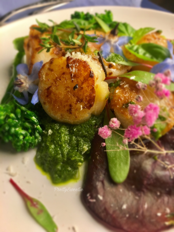 Хотите удивить близких?! Очень подходит для романтического вечера. Синие огуречные цветы, как подснежники, напоминают о весне. Свежий, не жирный соус прекрасно оттеняет сладковатый вкус гребешка, очень удачное сочетание.